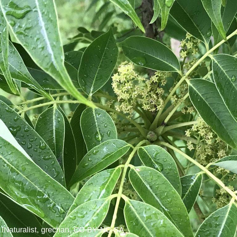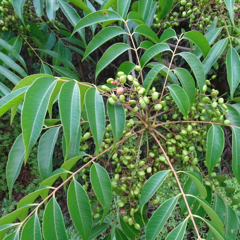 Family: Anacardiaceae Scientific name: Toxicodendron succedaneum Description: Plant Form: Small to medium size deciduous tree. Size: Up to 10 m tall, usually 2-5 m. Stem: Grey with vertical markings. Leaves: Bright green and greyish underneath, alternate on branches, consist of 9-15 lance to egg-shaped leaflets with single leaflet at end of branch. Change to red in winter. Flowers: Creamy white to yellowish green, clustered into flowering heads. Fruit and Seeds: Pale brown, round to egg shaped to 1 cm diameter with hard central stone. Habitat: Roadsides, wasteland, woodland edges. Distinguishing Features: Distinguished from similar trees mainly by the single end leaflet and leaves going red in winter. Weed Status: Priority Weed Weed Type: Common, Invasive Garden Escapee Lifeform: Woody/tree