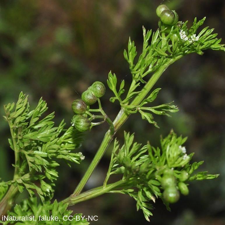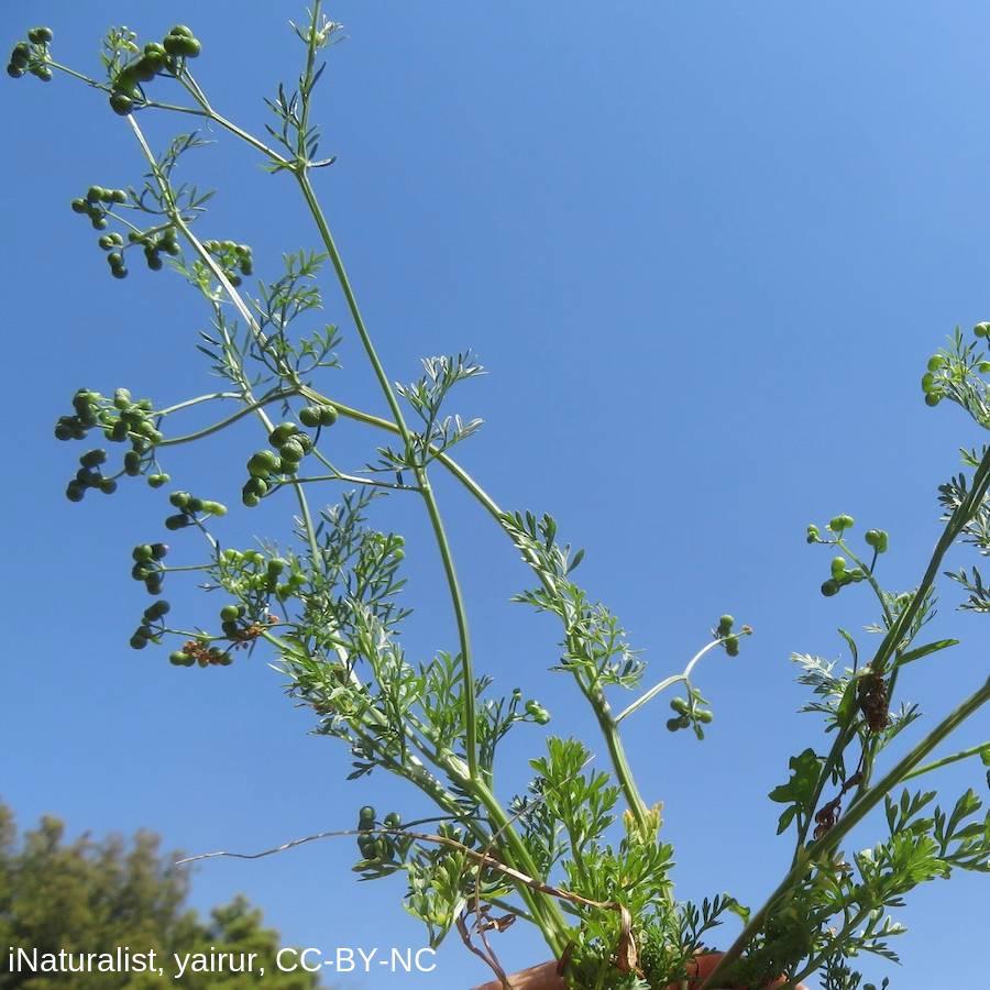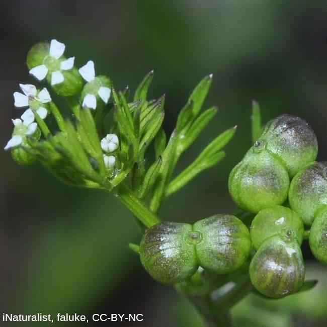 Family: Apiaceae Scientific name: Bifora testiculata Description: Plant Form: Erect annual herb. Size: Up to 30 cm tall. Stem: Stripy appearance. Leaves: Narrow, finely-divided. Flowers: Small, white, with 5 petals that have notched tips. In umbrella-shaped clusters. Fruit and Seeds: Dry, globular with a wrinkly appearance. Habitat: Cropping land, waste areas. Weed Status: Priority Weed Weed Type: Agricultural Lifeform: Herbaceous