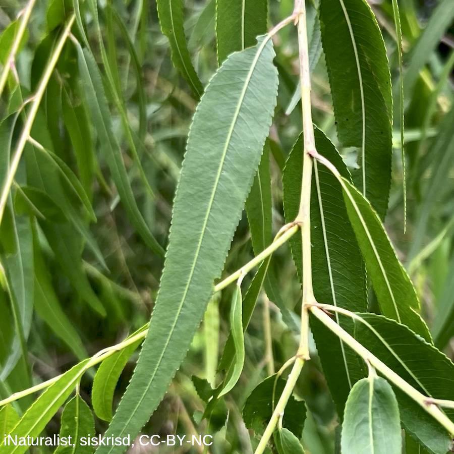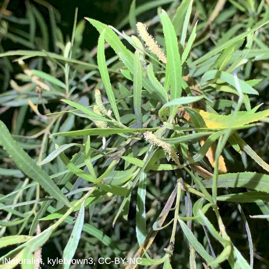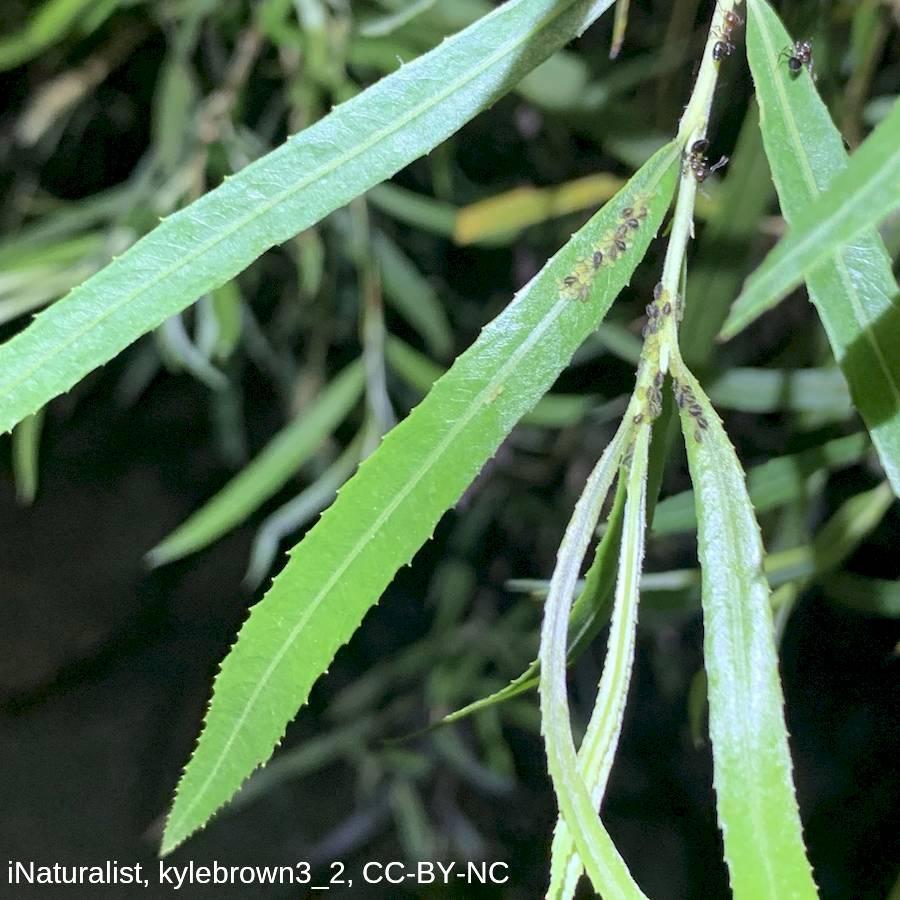 Family: Salicaceae Scientific name: Salix nigra Description: Plant Form Upright deciduous tree. Size Up to 20 m tall. Stem Trunk rough brown to grey with deep cracks, young branches purplish-brown shiny and smooth. Leaves Bright green on both sides, 4-10 cm long, slender tapering to a pointed tip, with fine teeth along edges. Flowers Male flowers yellow with no petals, female flowers green with no petals. Grounded in long cylindrical clusters. Fruit and Seeds Straw coloured, oval-shaped capsules about 5 mm long. Seeds are covered in long silky cotton-like hairs. Habitat Riparian areas, wetlands, swamps. Distinguishing Features Distinguished from Grey sallow (Salix cinerea) by being generally taller, having a single stem, and having hairless leaves with toothed edges. Weed Status: Priority Weed Weed Type: Environmental, Agricultural, Common Lifeform: Woody/tree