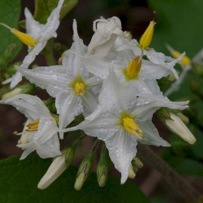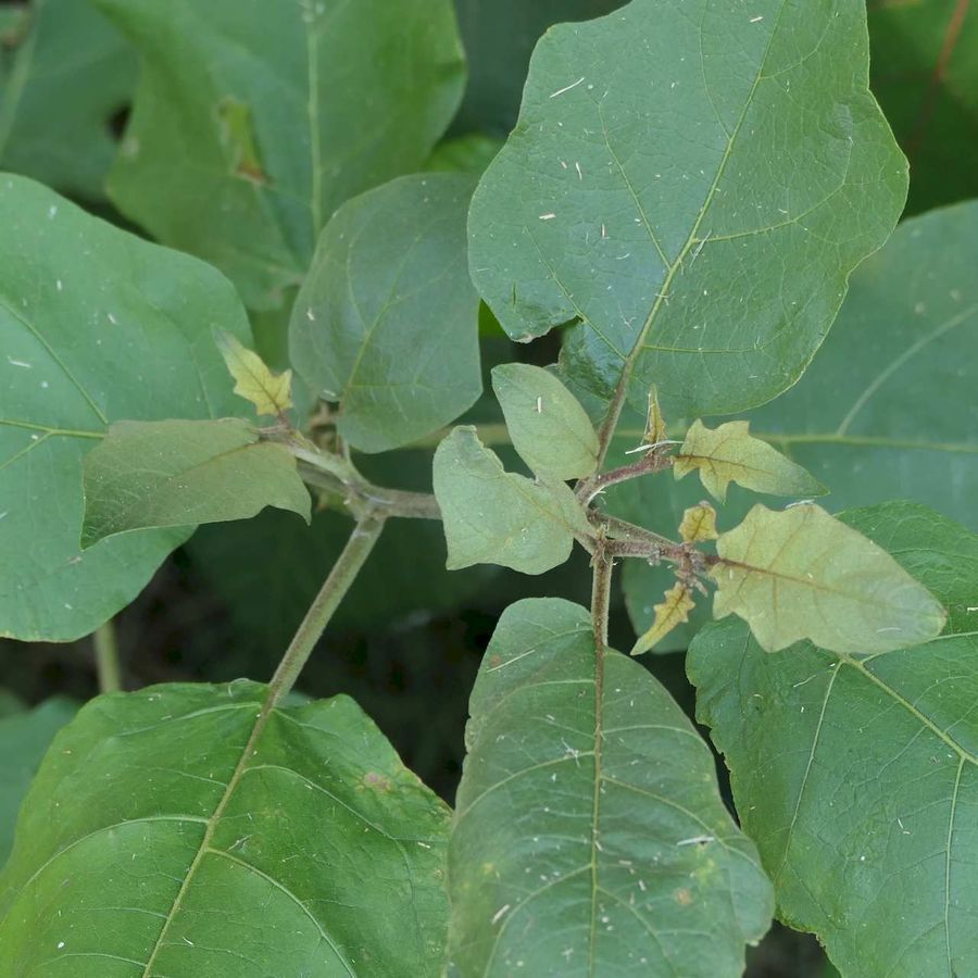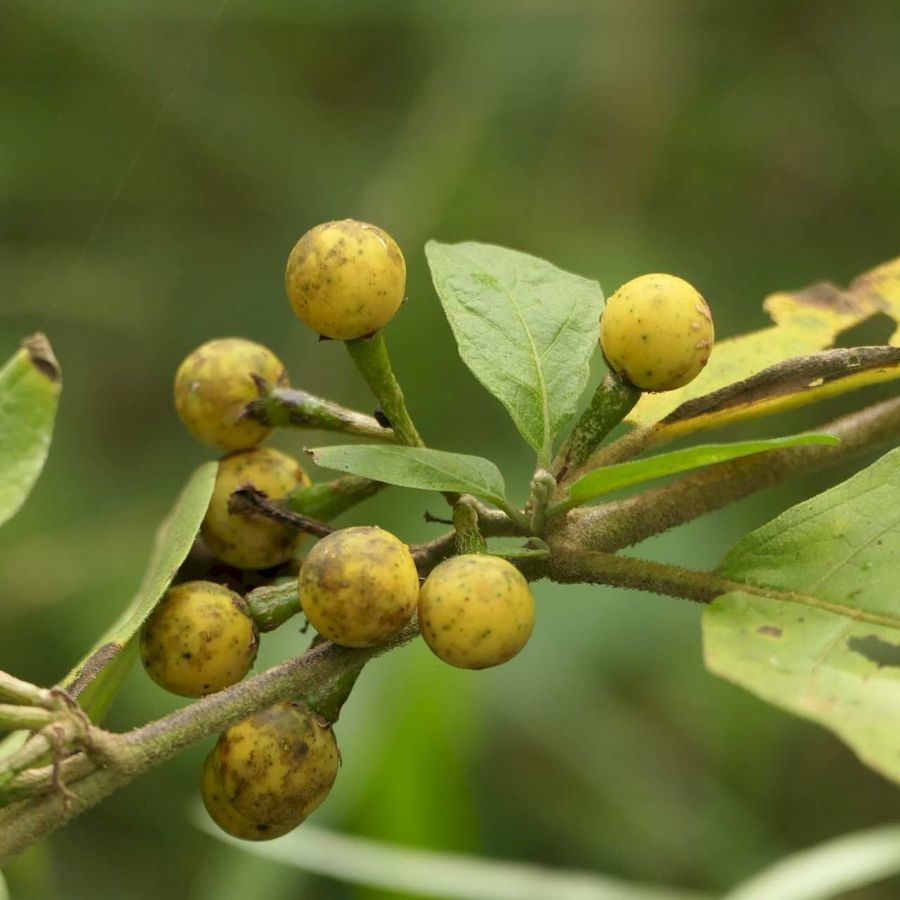 Family: Solanaceae Scientific name: Solanum torvum Description: Plant Form: Erect shrub or small tree. Size: 80 cm to 5 m tall. Stem: Green or purplish and hairy turning to brown and less hairy with age. Sometimes sparsely covered with 3-7 mm long prickles. Leaves: Alternate along stem, green on top with paler green underneath, oval shaped and often with lobes, cream coloured vein running down middle which is sometimes prickly. Flowers: White, star shaped with yellow central column. Up to 2.5 cm wide. In large clusters of 15-100. Fruit and Seeds: A round berry, initially green ripening to yellow, and black when dried out. Contains white, pale yellow or dull brown seeds. Habitat: Gardens, woodlands, waterways, pastures, roadsides. Distinguishing Features: Smaller than Giant devil's fig (Solanum chrysotrichum), and larger than Tropical soda apple (S. viarum) but with smaller fruit. Weed Status: Priority Weed Weed Type: Environmental, Agricultural, Common Lifeform: Shrubby, Woody/tree