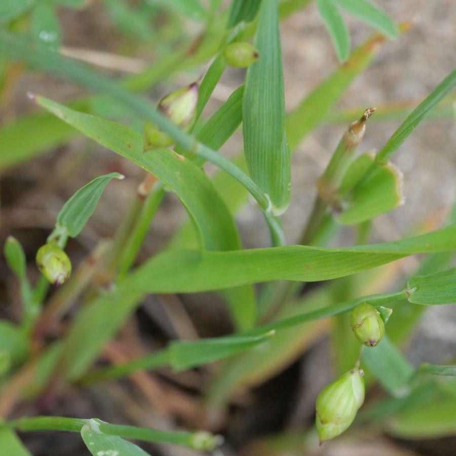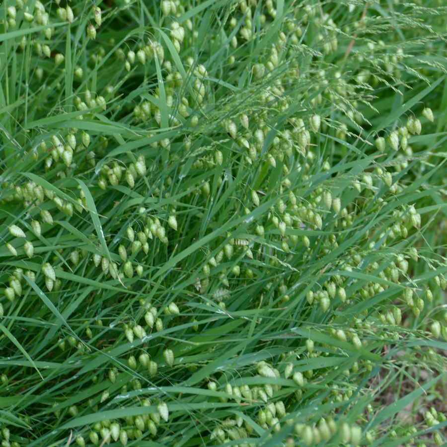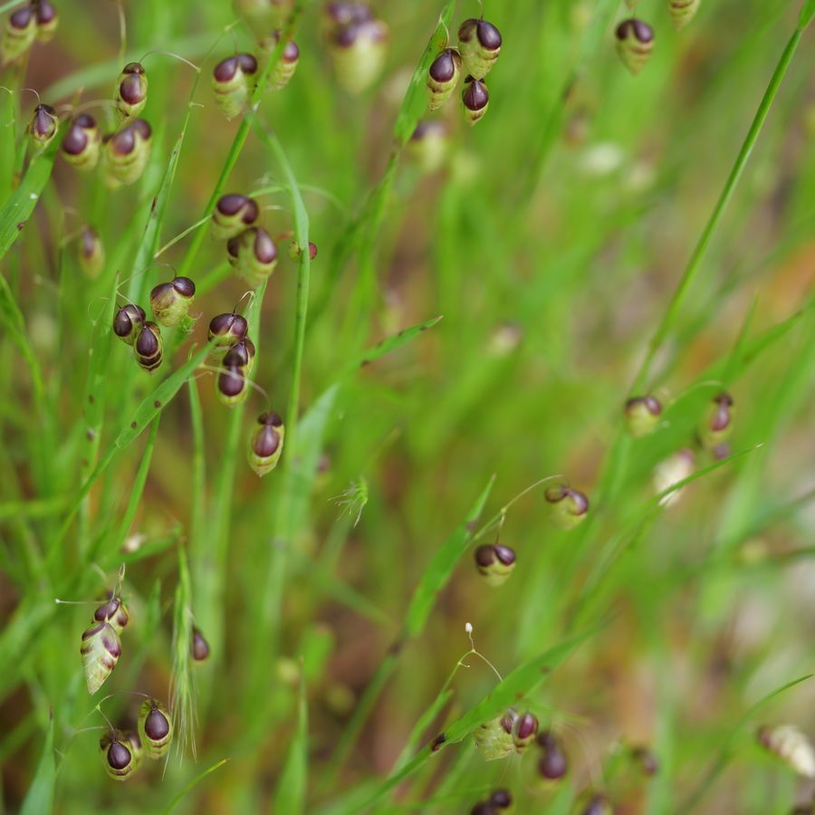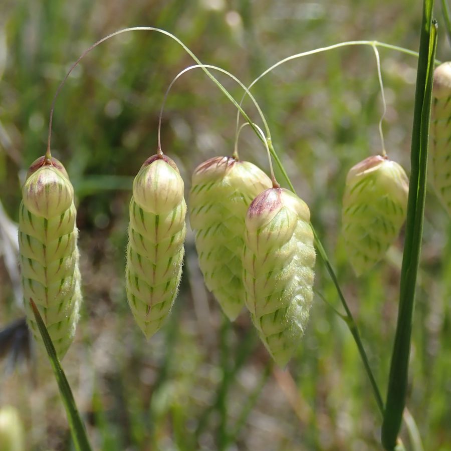 Family: Poaceae Scientific name: Briza maxima Description: Plant Form Annual grass. Size Up to 65 cm tall. Stem Upright, hairless, somewhat hollow between joins. Leaves Blades up to 20 cm long, partially enclose the stem. Flowers Seed head is branched with 3-12 distinctive large drooping spikelets surrounded by papery bracts. Fruit and Seeds Flowers break apart at maturity to leave florets containing grains 2.5 mm long. Habitat Gardens, disturbed areas, urban areas, roadsides, grasslands, open forests. Distinguishing Features Has much larger seed heads than Lesser Quaking-Grass (Briza minor). Weed Status: Other Weed Weed Type: Environmental, Common Lifeform: Grassy